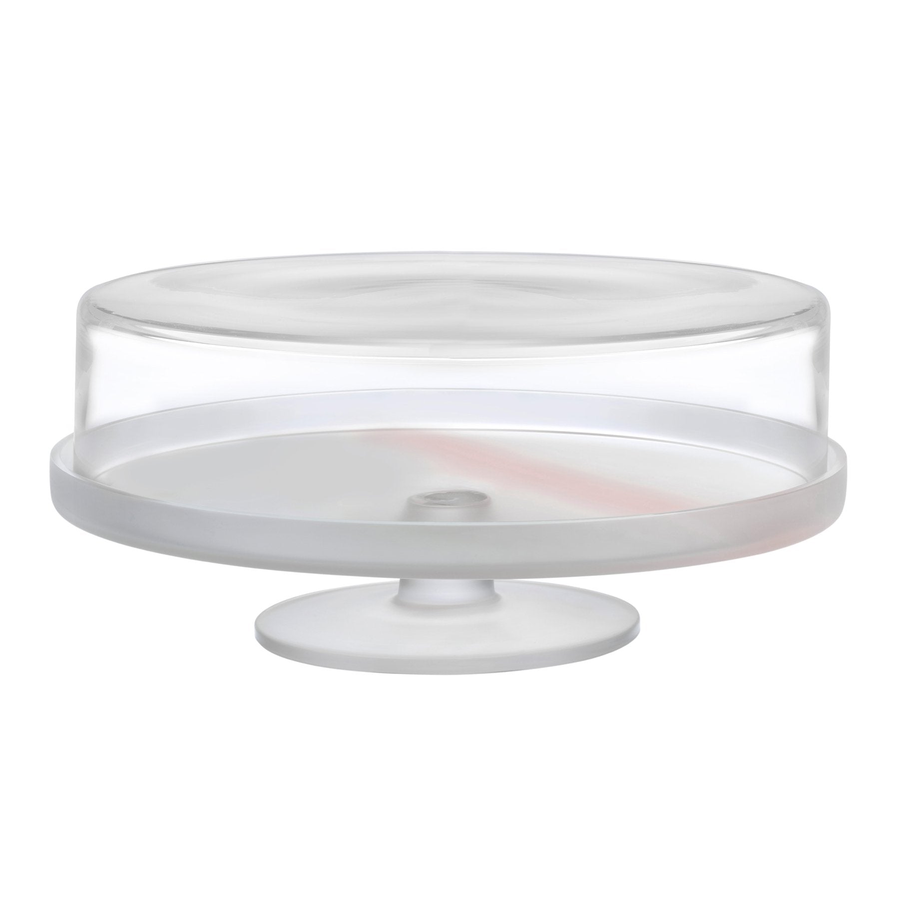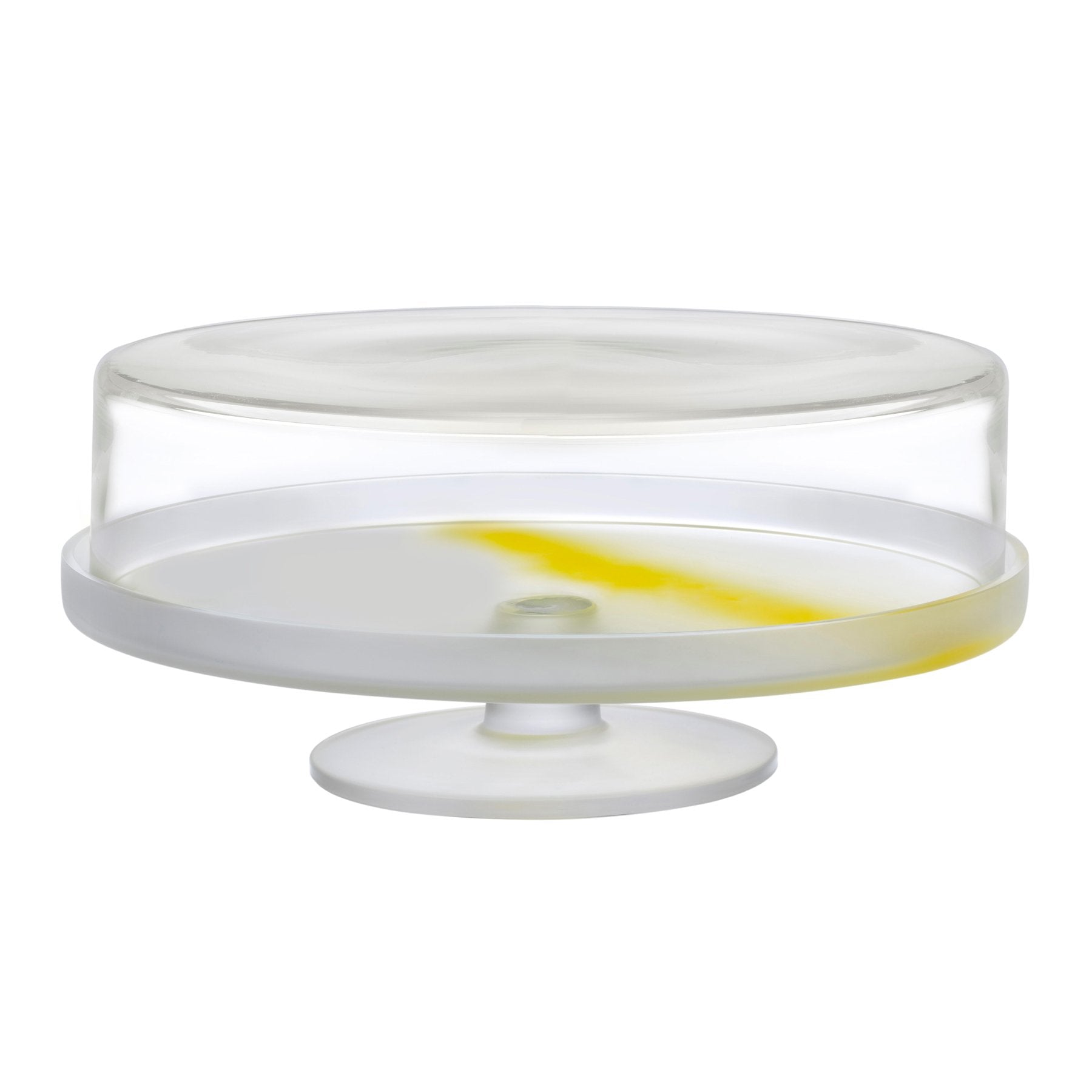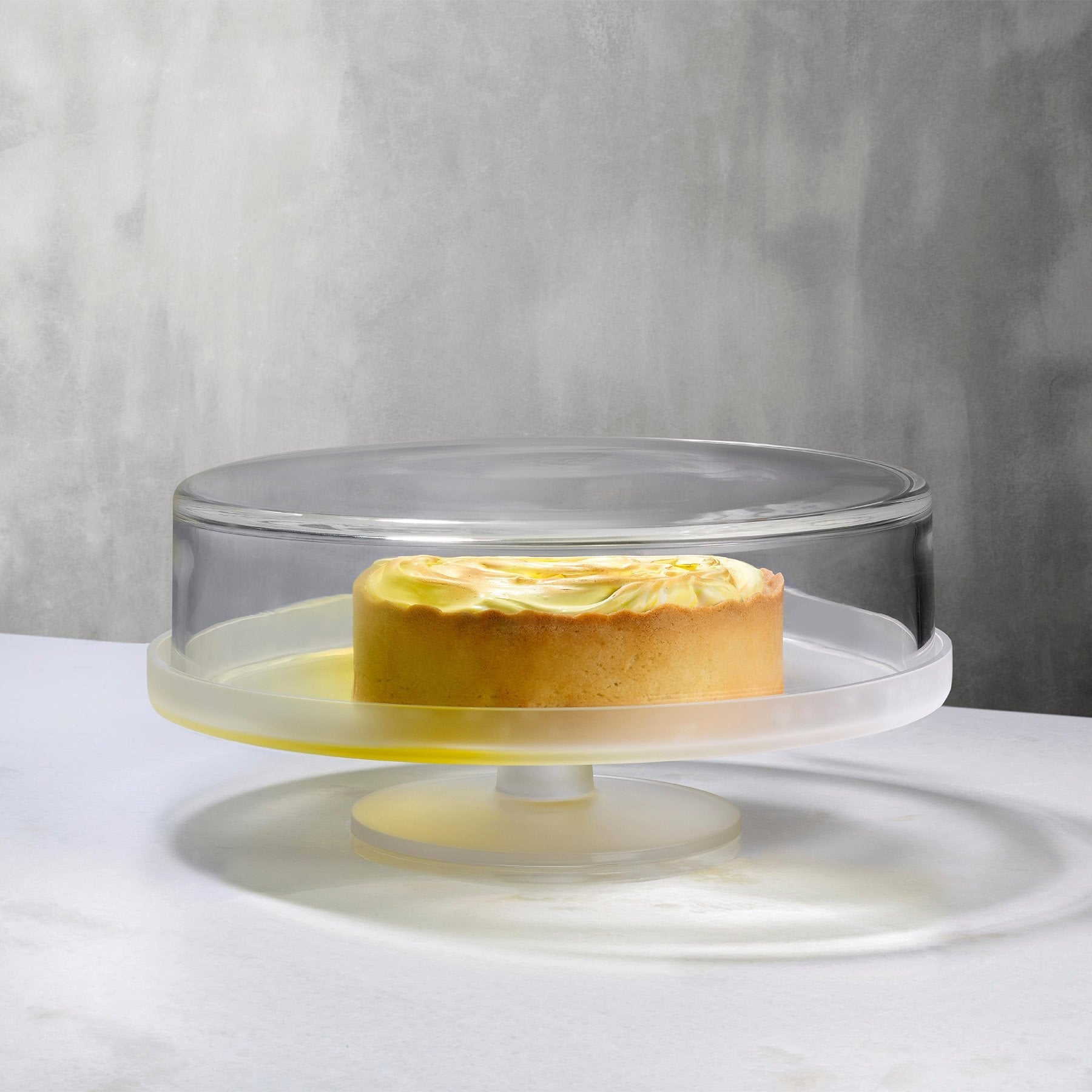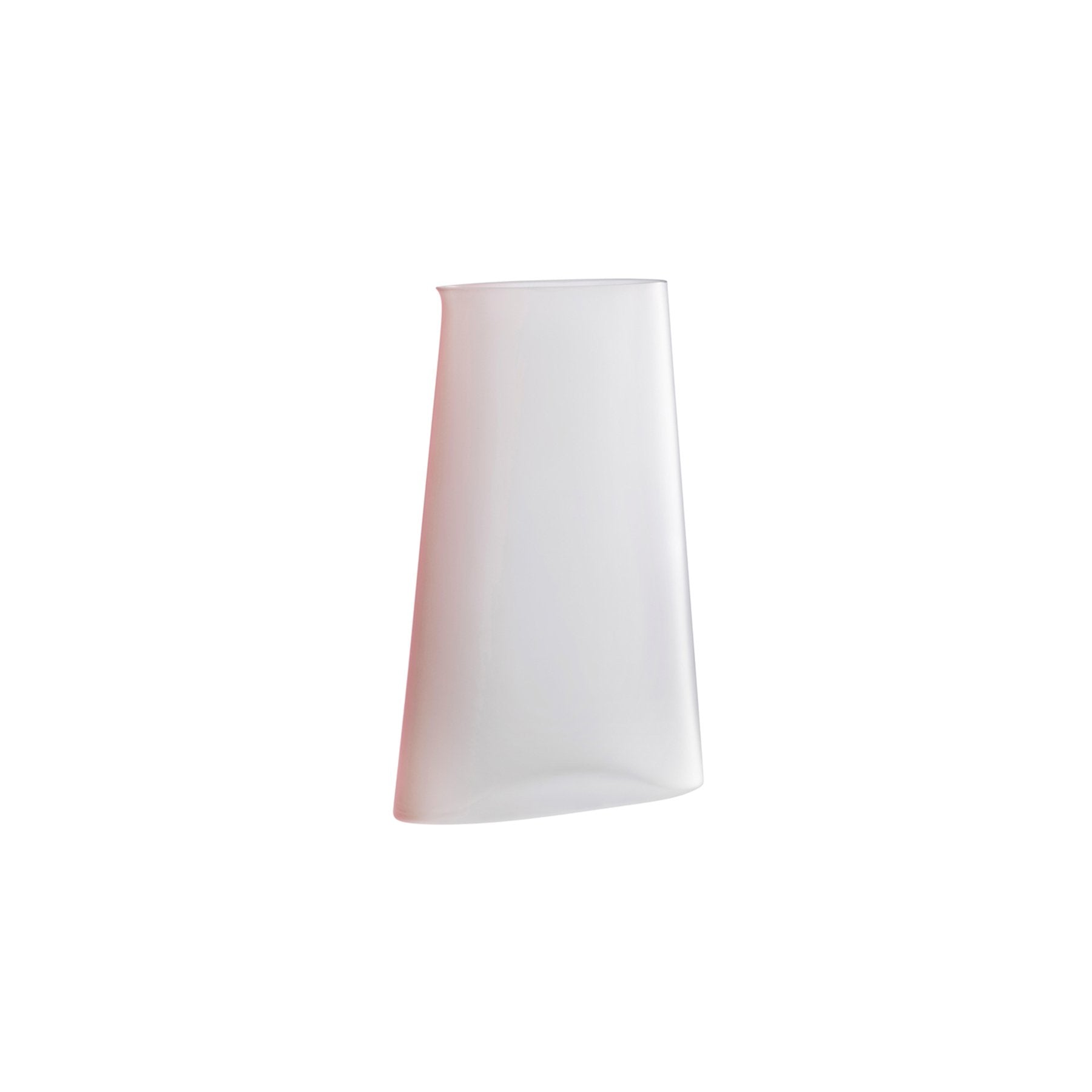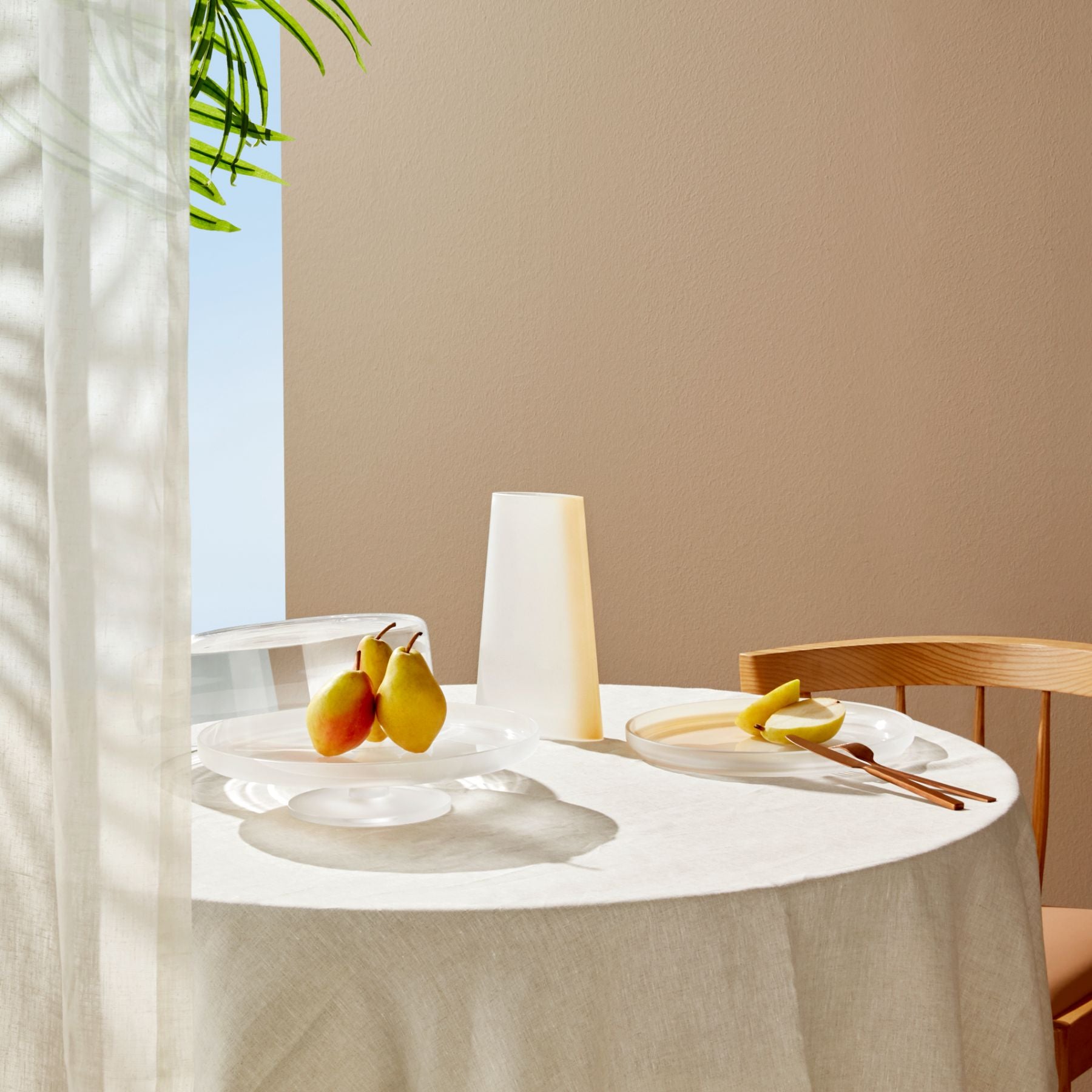 The minimalist NUDE Pigmento collection comprises pitchers, cake domes, storage boxes and serving dishes — including this small 22 cm version. The minimal, elegantly shaped silhouette is formed from the mouth-blown crystalline glass that displays a sandblasted matte look and subtle nuances in colour — here in a pastel pink hue — owing to a unique pigmentation technique, where the pigment is sprayed by hand onto the finished product.